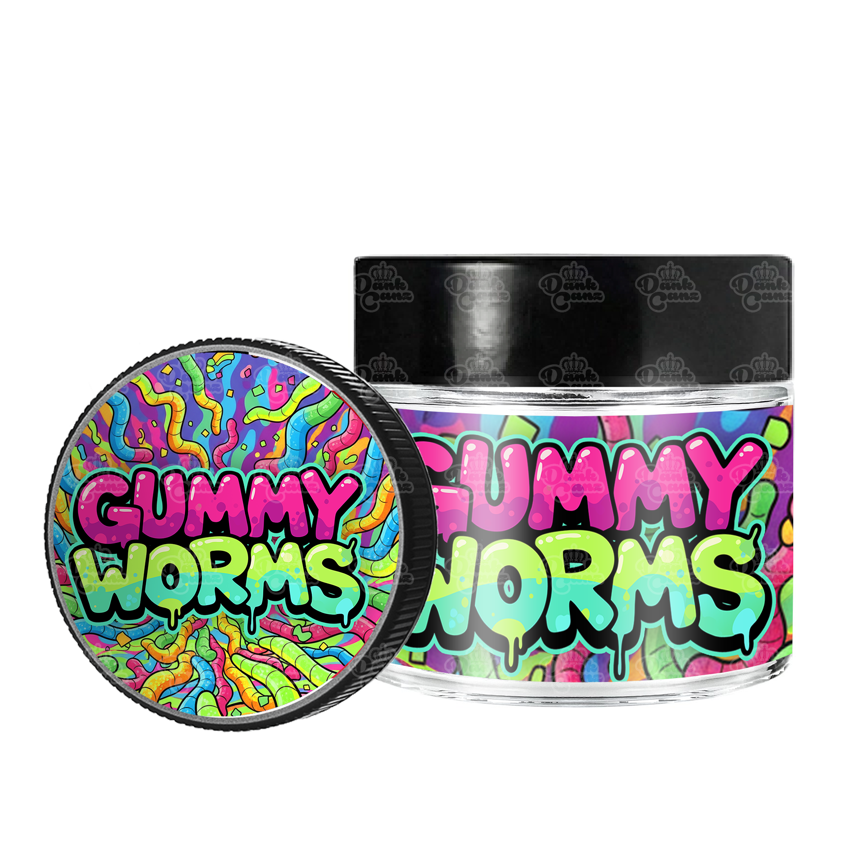 Gummiwürmer, 3,5 g/60 ml Glasgefäße – vorbeschriftet