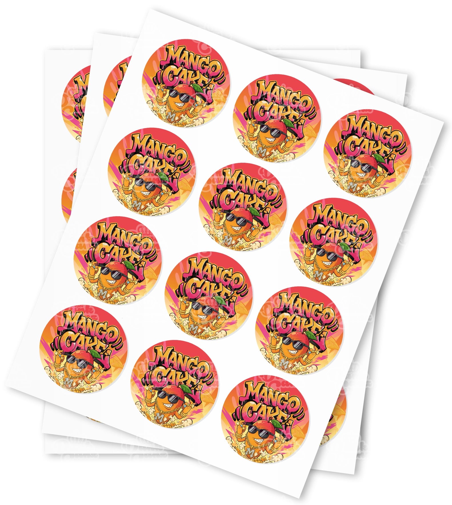 High quality water proof Mango Cake gloss stickers supplied on sheets. Available in quantities of 50,100 & 1000.