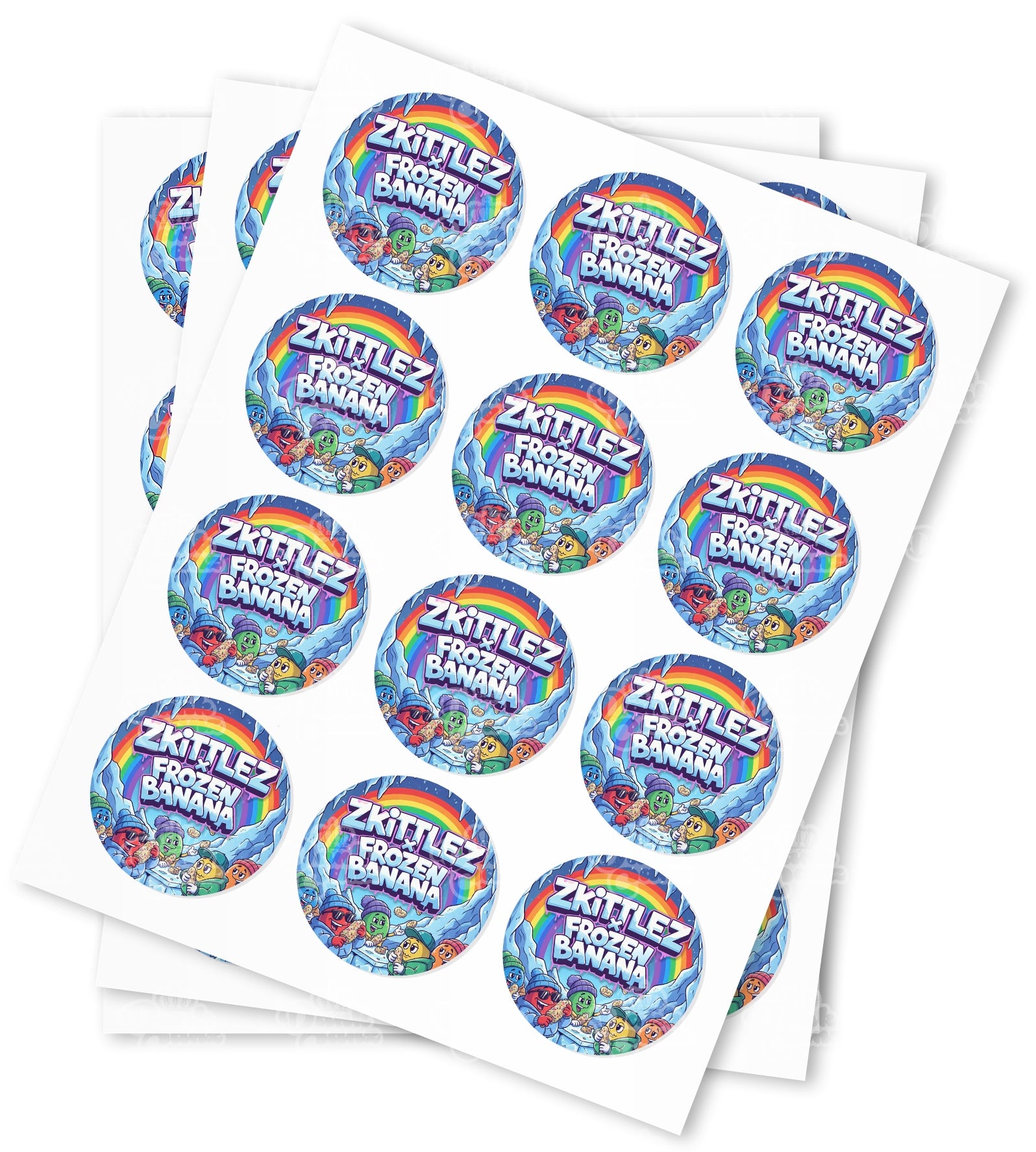 High quality water proof Zkittlez x Frozen Banana gloss stickers supplied on sheets. Available in quantities of 50,100 & 1000.
